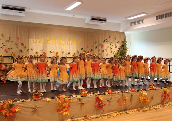 Na 1 piętrze mamy kuchnię i dużą jadalnię a na parterze salę gimnastyczno-teatralną gdzie odbywają się zajęcia rytmiczne i gimnastyczne.